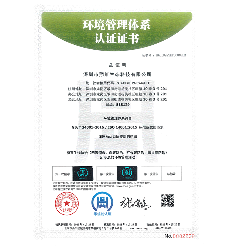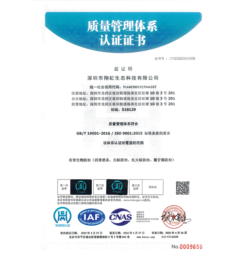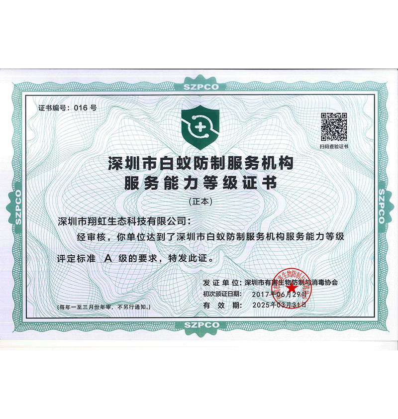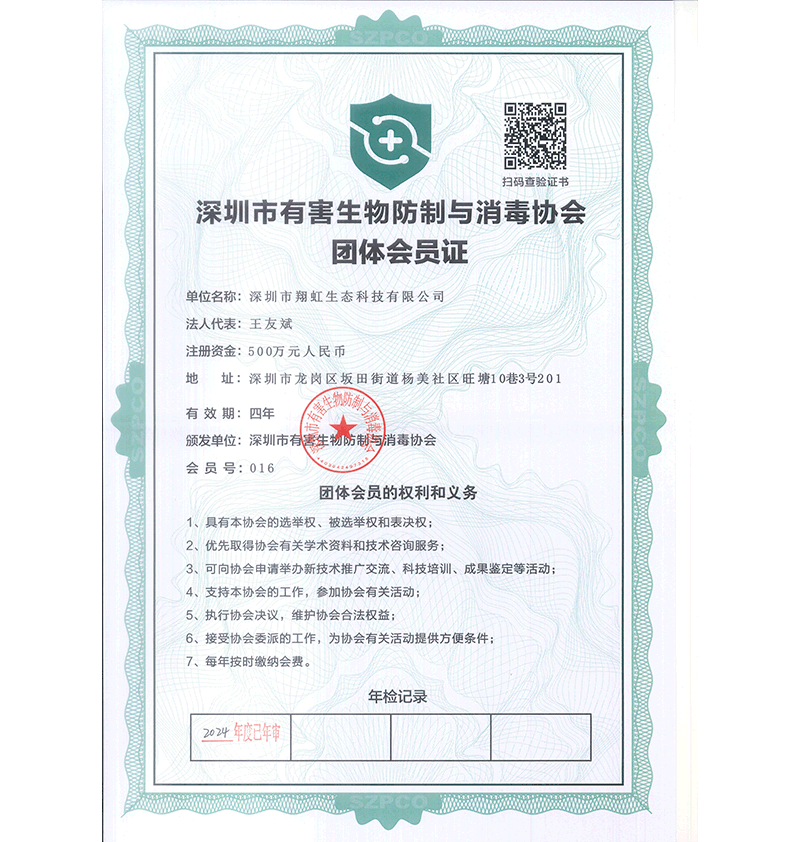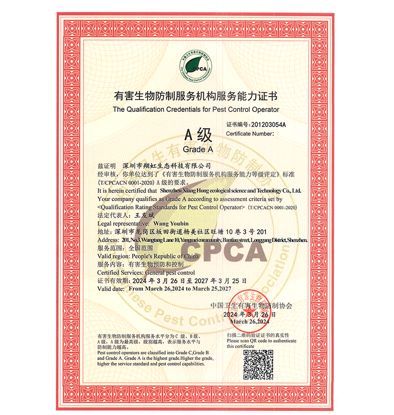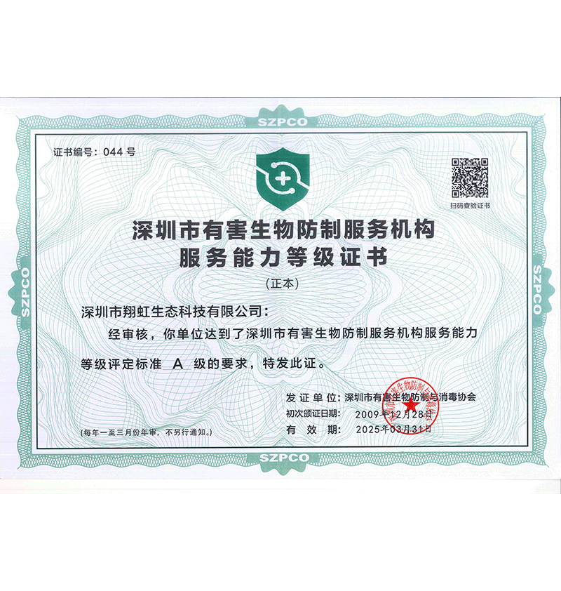 深圳市翔虹生態(tài)科技有限公司成立于1995年,是深圳最早成立的專業(yè)蟲害防治公司之一。公司發(fā)展至今獲得全國有害生物防制服務(wù)A級資質(zhì)、廣東省有害生物防制服務(wù)A級資質(zhì)、深圳市有害生物防制服務(wù)A級資質(zhì)、廣東省有害生物防制服務(wù)A級資質(zhì)、深圳市有害生物防制服務(wù)甲級資質(zhì)的單位,是中國有害生物防治協(xié)會(huì)會(huì)員、廣東省有害生物防治協(xié)會(huì)會(huì)員、深圳市有害生物防治協(xié)會(huì)理事單位,多次獲得“深圳市十佳消殺單位”榮譽(yù)。